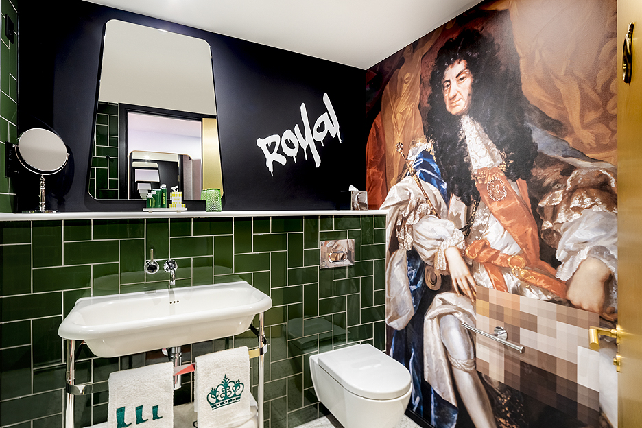 When I get to my room, I see that the reading lamp above a comfy wing chair (upholstered, it would seem, by Jackson Pollack), is a black-metal bowler hat suspended from the ceiling. Punk graffiti adorns the walls of the 190 unique guest rooms, and towels are emblazoned with “King” and “Queen.” The obligatory amenity slippers are flip-flops, embellished with a design pattern of neon-colored, geometric shapes. In the loo is the pièce de resistance: On the wall, facing the commode is a larger than life portrait of Louis Quatorze, with his entire groin pixilated, as if he were naked, and the artist wanted to spare the hotel guest the shock!