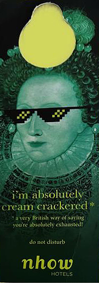 Amenities abound. The nhow has more room amenities and toiletries than a posh, five-star property-bath salts, lip balm, and even little packets of throw-in-your-pocket tissues. And lest I forget: The “Do Not Disturb” door-hanger features a somewhat digitized picture of Queen Elizabeth, and alerts housekeeping: “I’m absolutely cream crackered.” (Yes, it means you’re exhausted, so Do Not Disturb.)