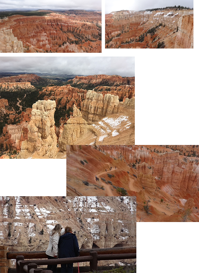 We drove through Zion – gorgeous and breathtaking – but we didn’t stop, Bryce being our destination. We planned to make Inspiration Point our first stop. As our vehicle was climbing higher and higher, snow began falling. Everything was beautiful and serene, until Sally suddenly said “We need to turn around. We obviously missed the turn-off for Inspiration Point.” We turned the vehicle around and drove, as the snow continued. We stopped at a look-out where we viewed Swamp Canyon and saw some mini-snowmen perched on the rail, that someone had left behind for us to enjoy.