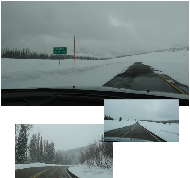 We got back on the road and after we’d driven approximately two miles, the heavy snow lightened up, turning to rain, and the fear of being stuck at the top of the mountain in a snow storm was lifted. At one point, we had actually been concerned about becoming stranded, to the extent that we took inventory of our food and water.