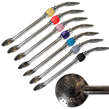 The metal straw is known as a bombilla or bomba and is traditionally made of silver. The bombilla functions both as a straw and as a sieve. The submerged end is flared, with small holes or slots that allow the brewed liquid to block the chunky yerba mate leaves that make up much of the mixture. A modern bombilla design uses a straight tube with holes or a spring sleeve to act as a sieve.