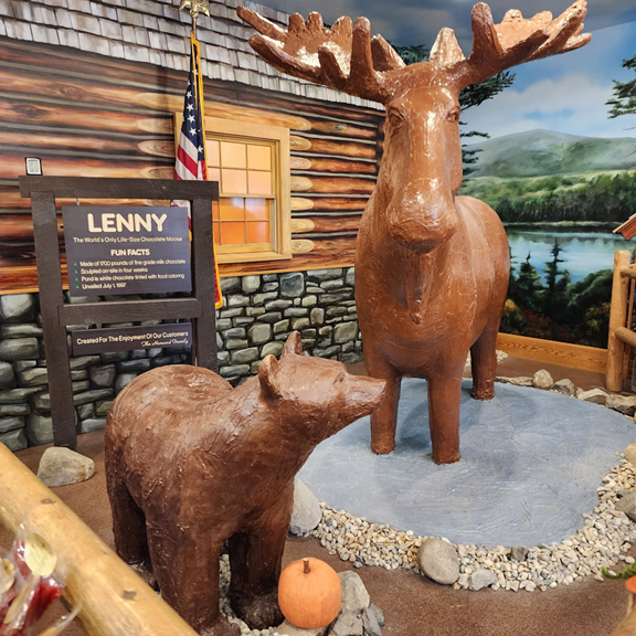 Sweeten the route with a detour to Scarborough’s Len Libby Candies for Lenny the Chocolate Moose, a 1,700-pound milk-chocolate behemoth unveiled in 1997. Eight feet tall and sculpted over a wire frame, Lenny lords over a blue-dyed white-chocolate pond, flanked by his “Bear Club” crew: 380-pound Mama Libby and cubs Cocoa and Chip, all dark chocolate. Watch the looping creation video while sampling butternut crunch—proof Maine’s wildlife comes in edible form.