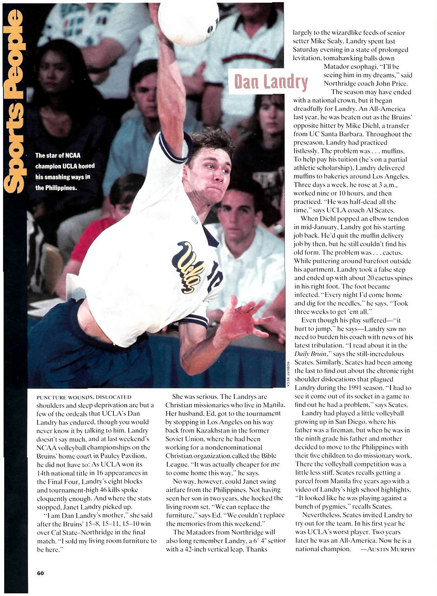 The next night the finals took place. Our humble little missionary kid son had over 40 kills and spent most of the night in the air. His 42-inch vertical jump was quite intimidating to his opponents. It was a night of glory. UCLA won it in straight sets, their first NCAA championship in four years. Dan was the standout player. We were the standout parents. At least that is how we felt. When it was over we mingled around the floor talking to people and Dan introduced us to a writer with Sports Illustrated who interviewed us. An article appeared next month in that magazine reporting on the championship and focusing on Dan and it told this amazing story of Dan’s crazy Mom who sold her living room furniture to see her son play volleyball on the night of his life. I know it was the night of our life.