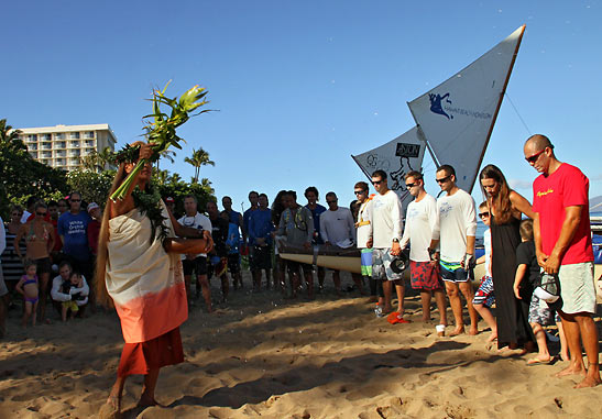 Hawaiian Cultural Practitioner giving a traditional blessing to canoe crews and spectators